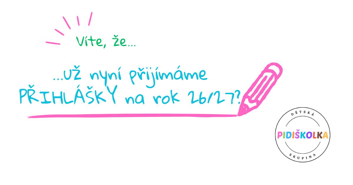 📝 ZÁPISY se totiž konají již 7. –10.4. 2026. Přihlášky najdete online na našem webu zde: Dětská skupina • Pidiškolka a také je tam spousta informací, které Vám zodpoví případné otázky… A kdyby náhodou ne, stačí se ozvat na kontakty uvedené v zápatí webu.
